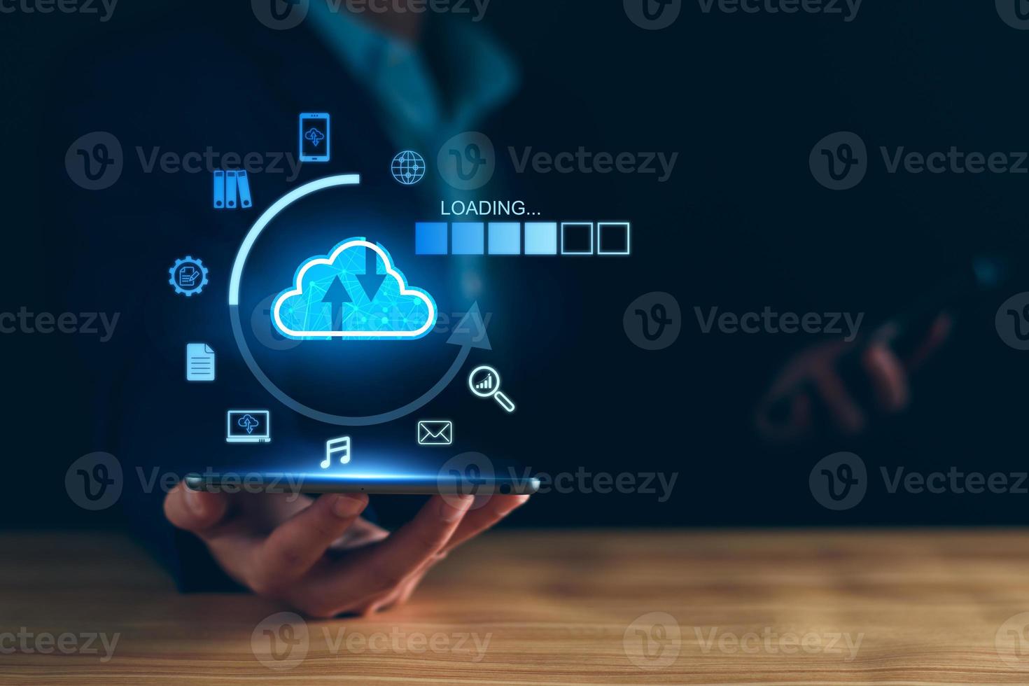 Data download from cloud computing concept. Man using smartphone and computer to download, upload business information, media files. Cloud computing technology, intelligent storage on Internet Pro Photo