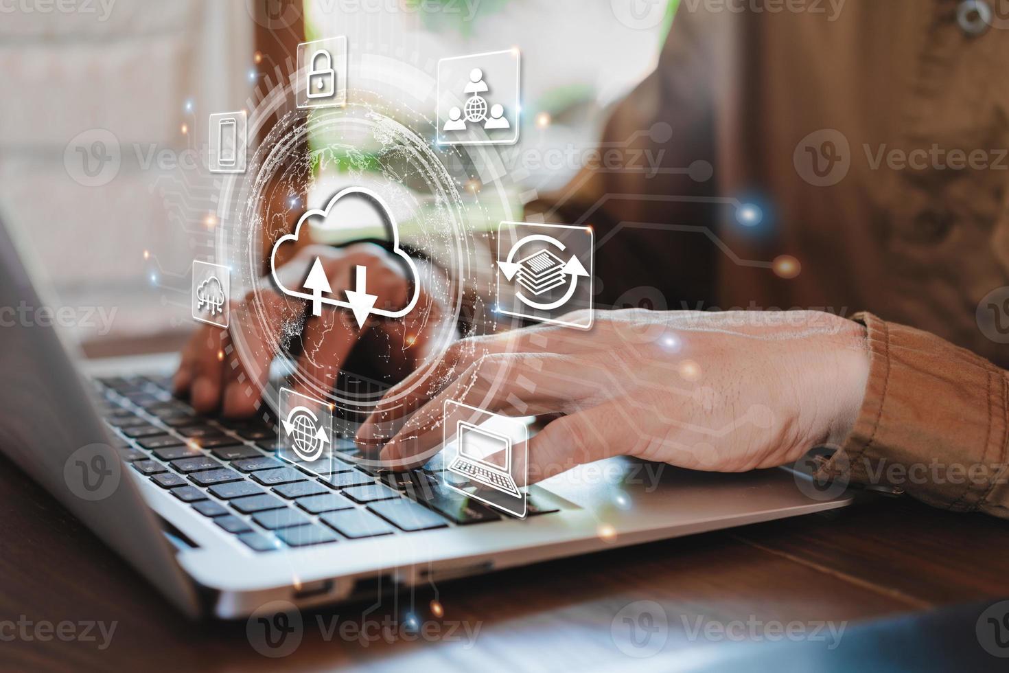 Businessman working and using laptop to access the cloud computing system, Internet Storage Networking and Cloud computing technology Pro Photo