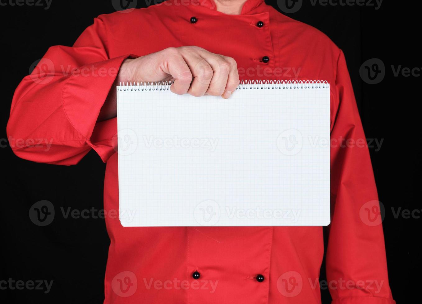 chef in red uniform holding open notepad with empty white sheets Pro Photo