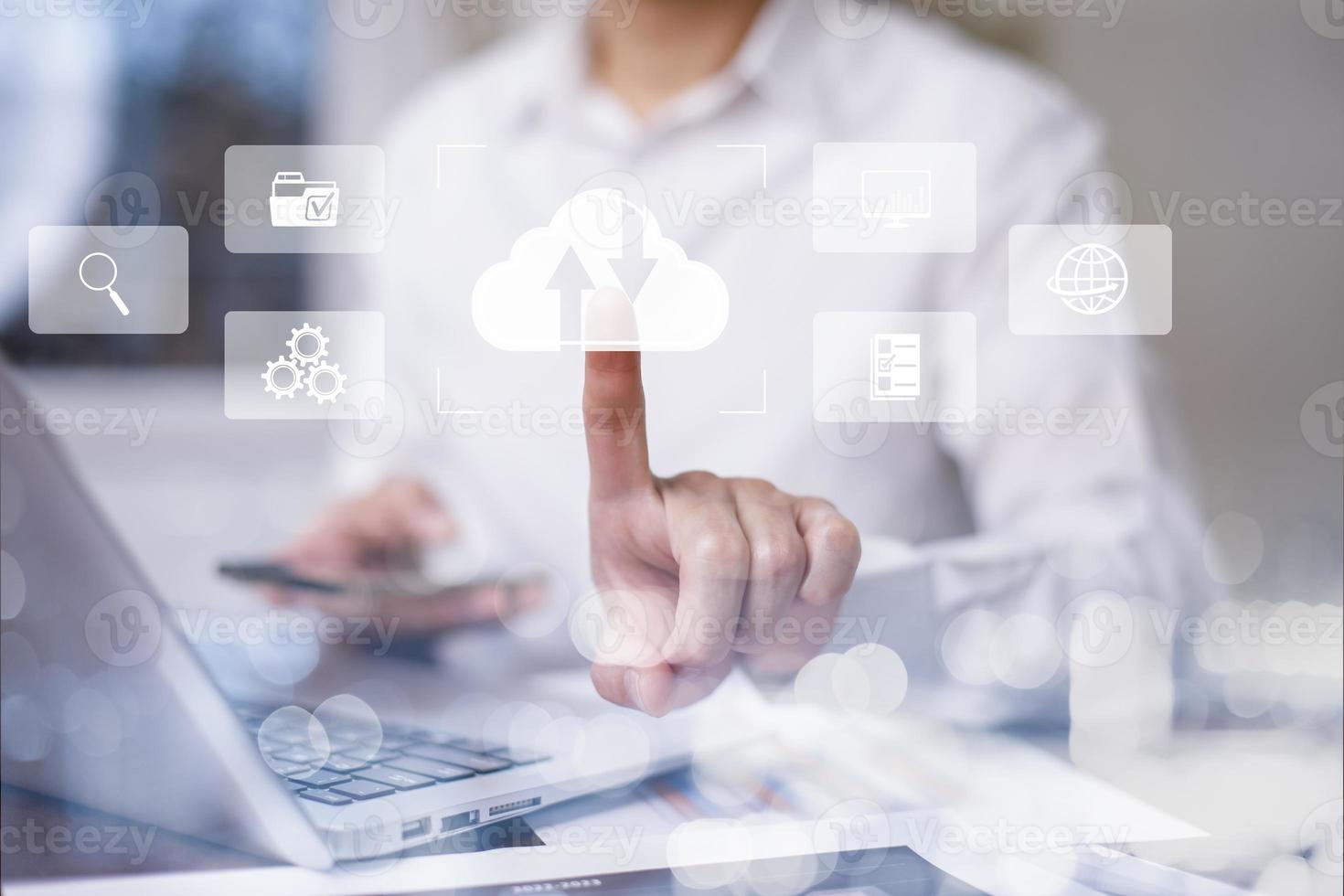 Man touching connect to data information on the Cloud Computing Technology Internet Storage Network Concept And a large database big data Through internet technology, Cloud sharing download and upload Pro Photo