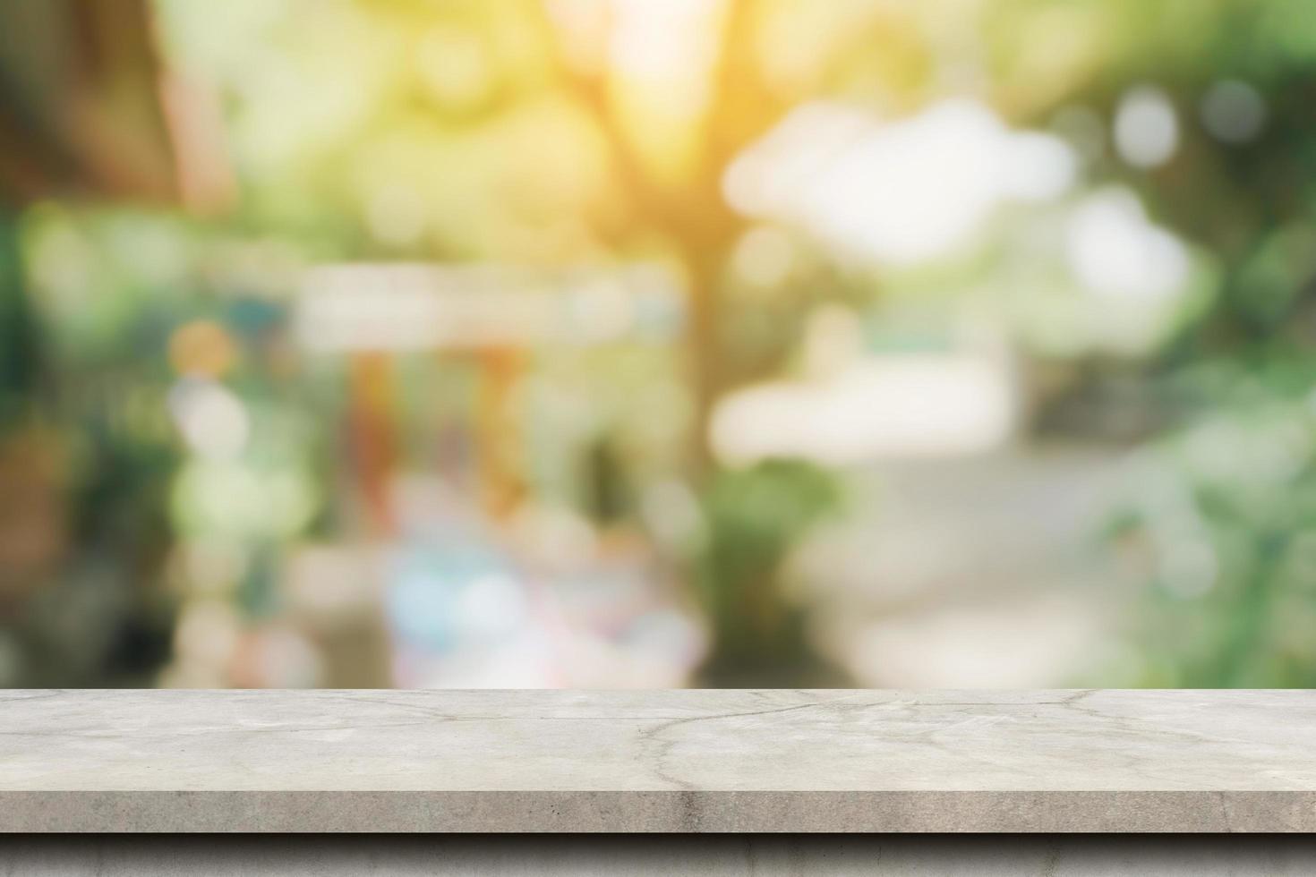 Empty concrete table and defocused bokeh and blur background of garden trees with sunlight. product display template. photo