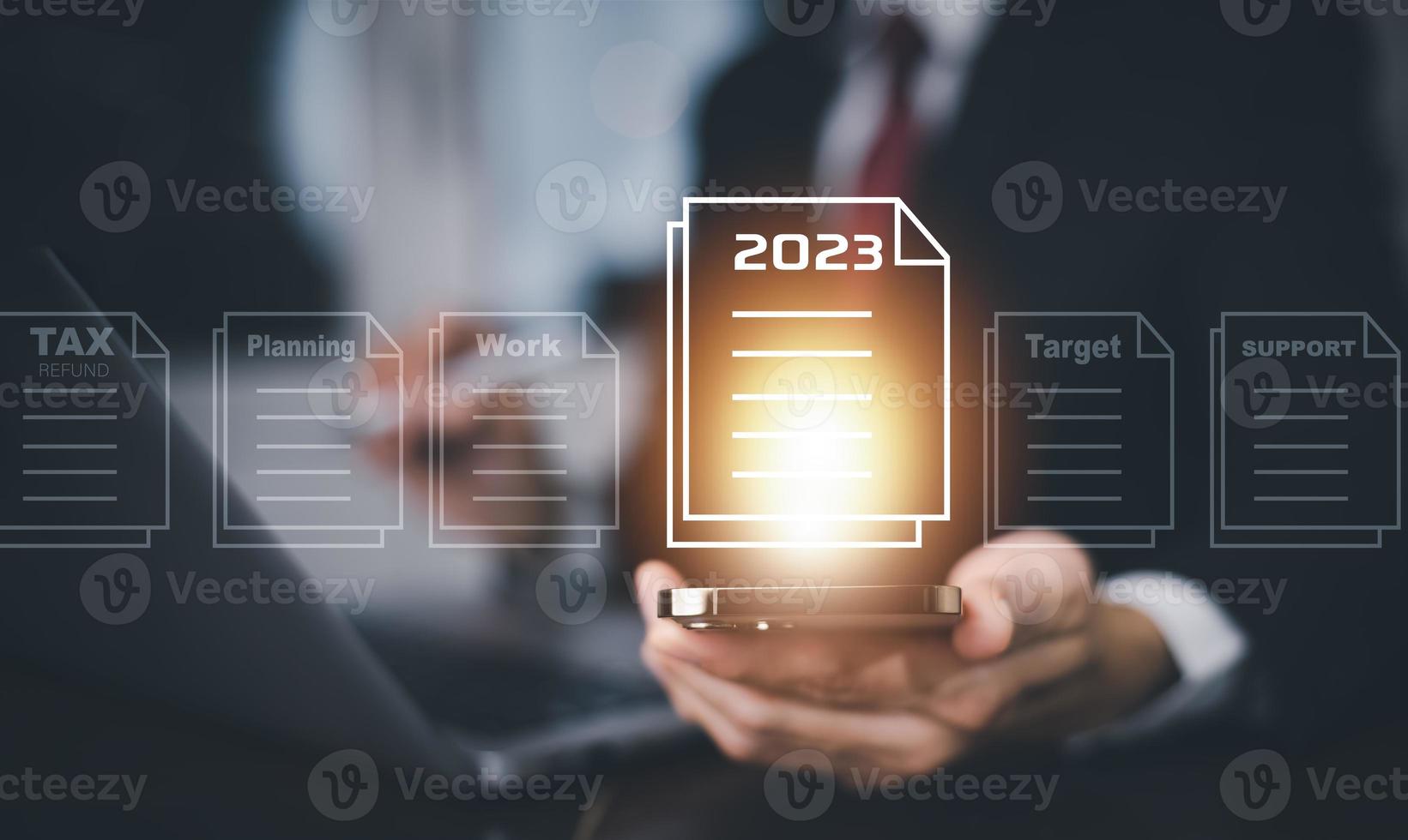 Concept Working and planning New year 2023, man using laptop and Smartphone with folder of document Management System, online documentation database, Business management, big data,finance technology. Pro Photo