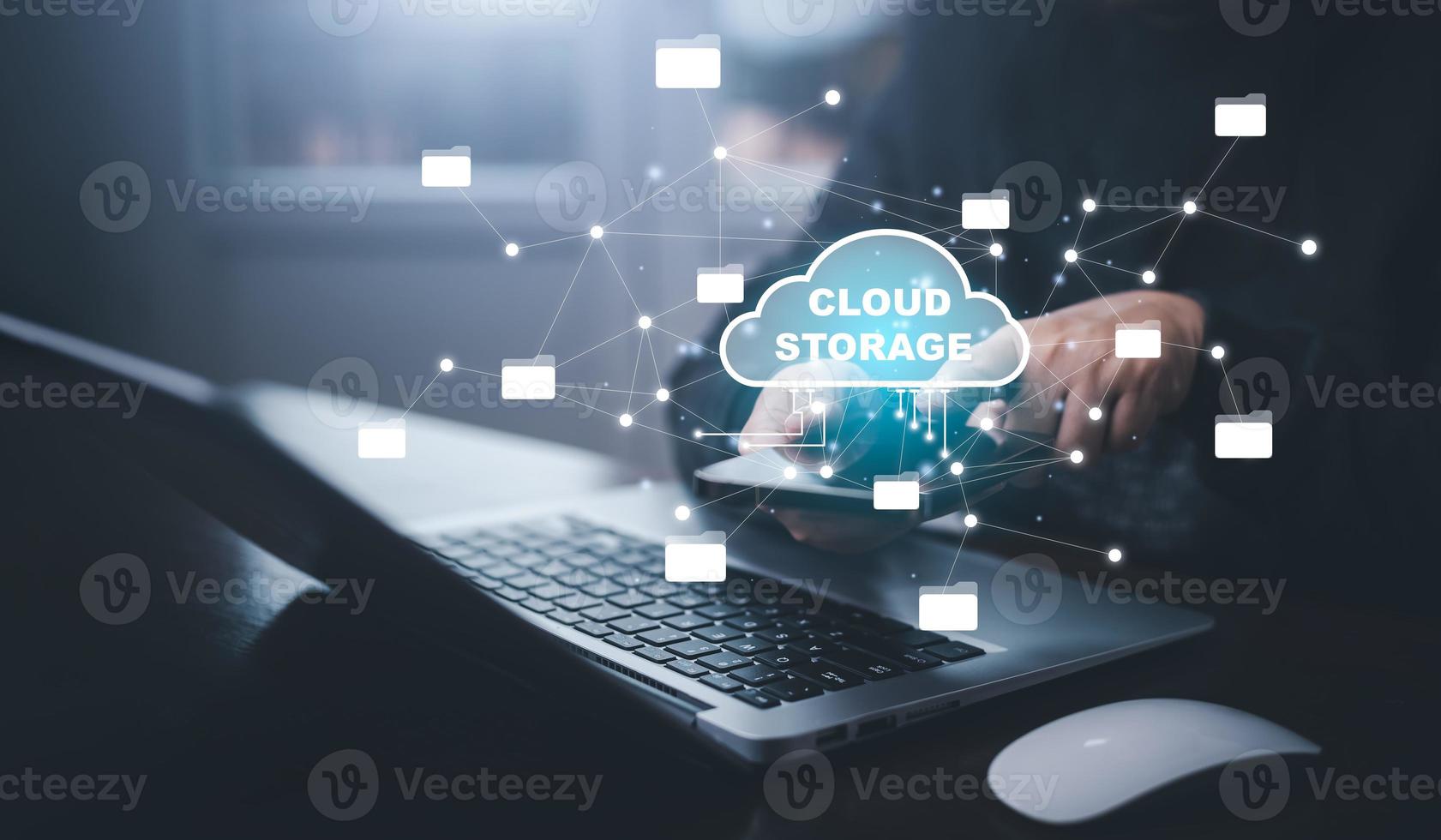 Businessman hand holding smartphone and laptop with cloud computing diagram show on hand. Cloud technology. Data storage. Networking and internet service concept, Cloud sharing download and upload Pro Photo