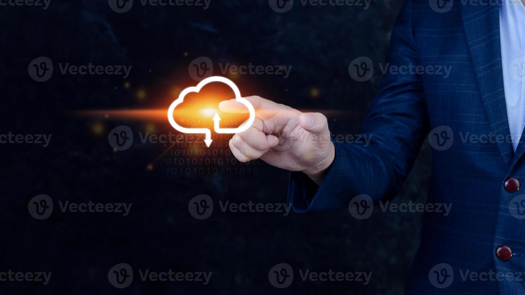 Businessman touching virtual cloud computing to transfer database. information upload, download application. Technology business transformation data concept..Big data Concept Pro Photo