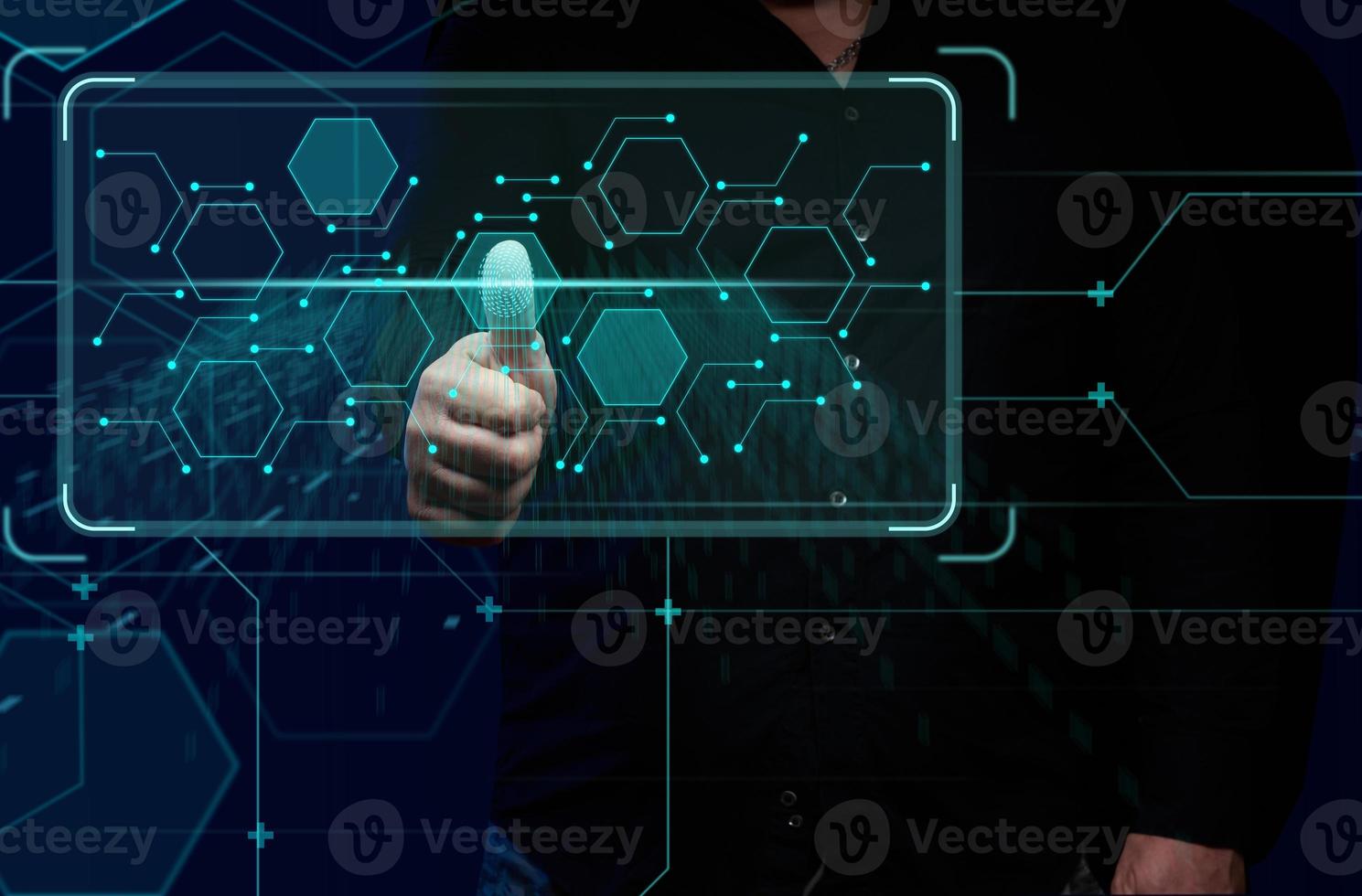 a man stands in front of a virtual screen with a security system and fingerprint identification. Personal data protection, online security Pro Photo