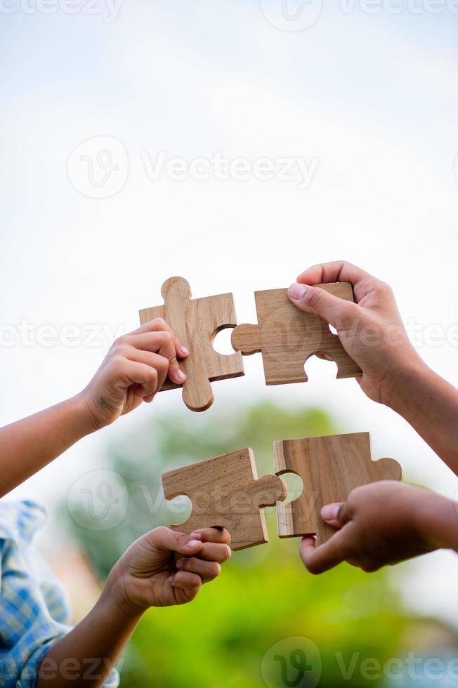 jigsaw and hands Combine the power of unity, teamwork, teamwork. Pro Photo