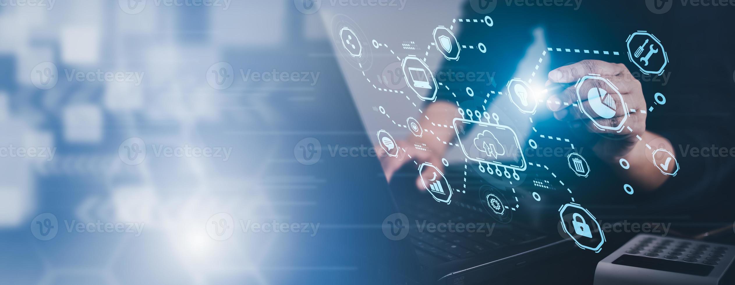 Man touching connect to data information on the Cloud Computing Technology Internet Storage Network Concept And a large database big data Through internet technology, Cloud sharing download and upload Pro Photo