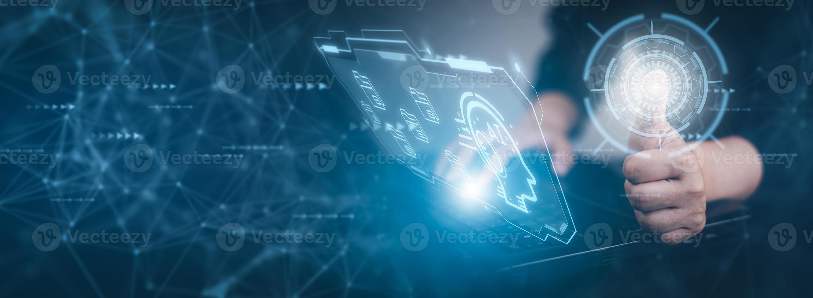 Businessman hold brain icon with Artificial Intelligence AI,on big data network machine learning and data on the dark background, artificial intelligence technology, innovation and futuristic. Pro Photo