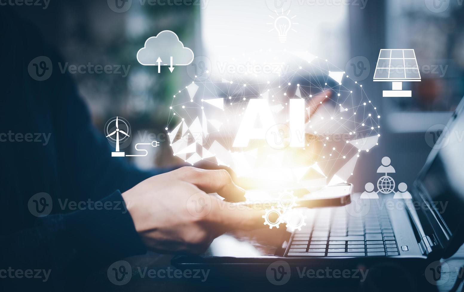Businessman hold brain icon with Artificial Intelligence AI ,on big data network machine learning and data on the dark background, artificial intelligence technology, innovation and futuristic. Pro Photo