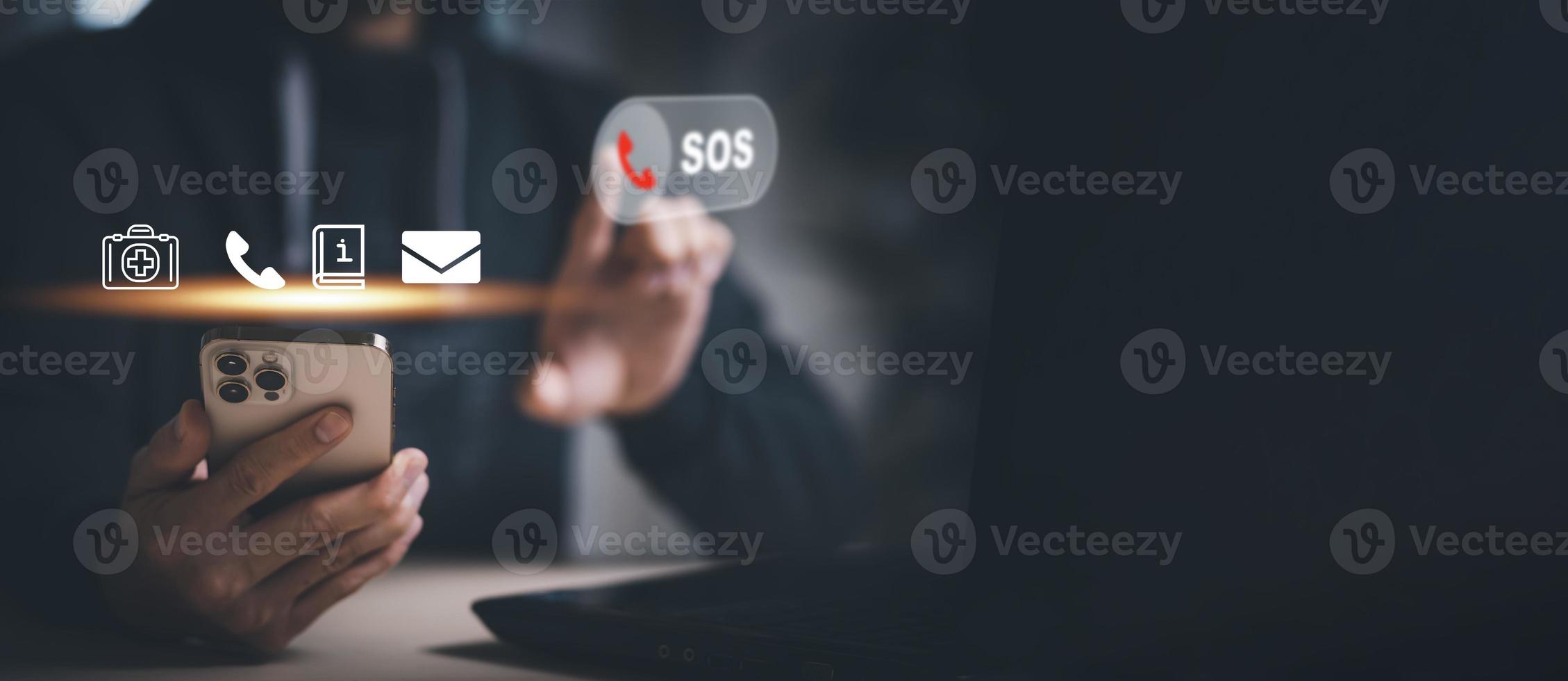 Hand touch button Emergency app in home, call phone, Chat message icon, Emergency application from smartphone for elderly, technology concept.Old hand touch mobile phone and call for help. Pro Photo