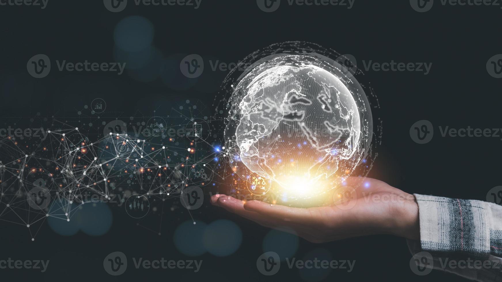 a man and virtual icon,modern cyberspace network technology concept,to communicate and connect information through a global society,innovative and scientific ideas,working through high speed internet Pro Photo