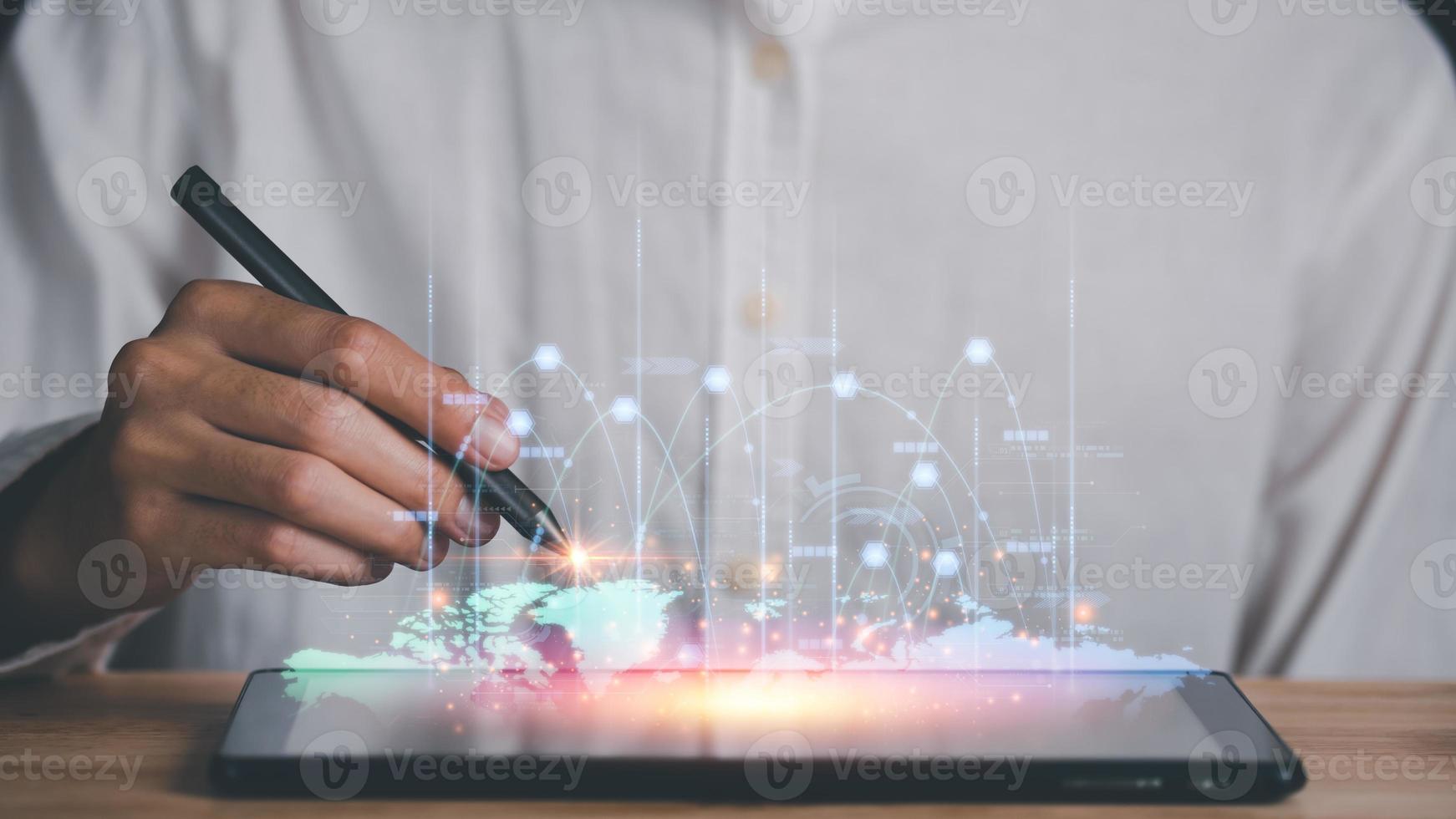 Businessman pointing to icon, showing global cyberspace technology network connection, internet data communication and business development, big data analytics, financial innovation and investment. Pro Photo