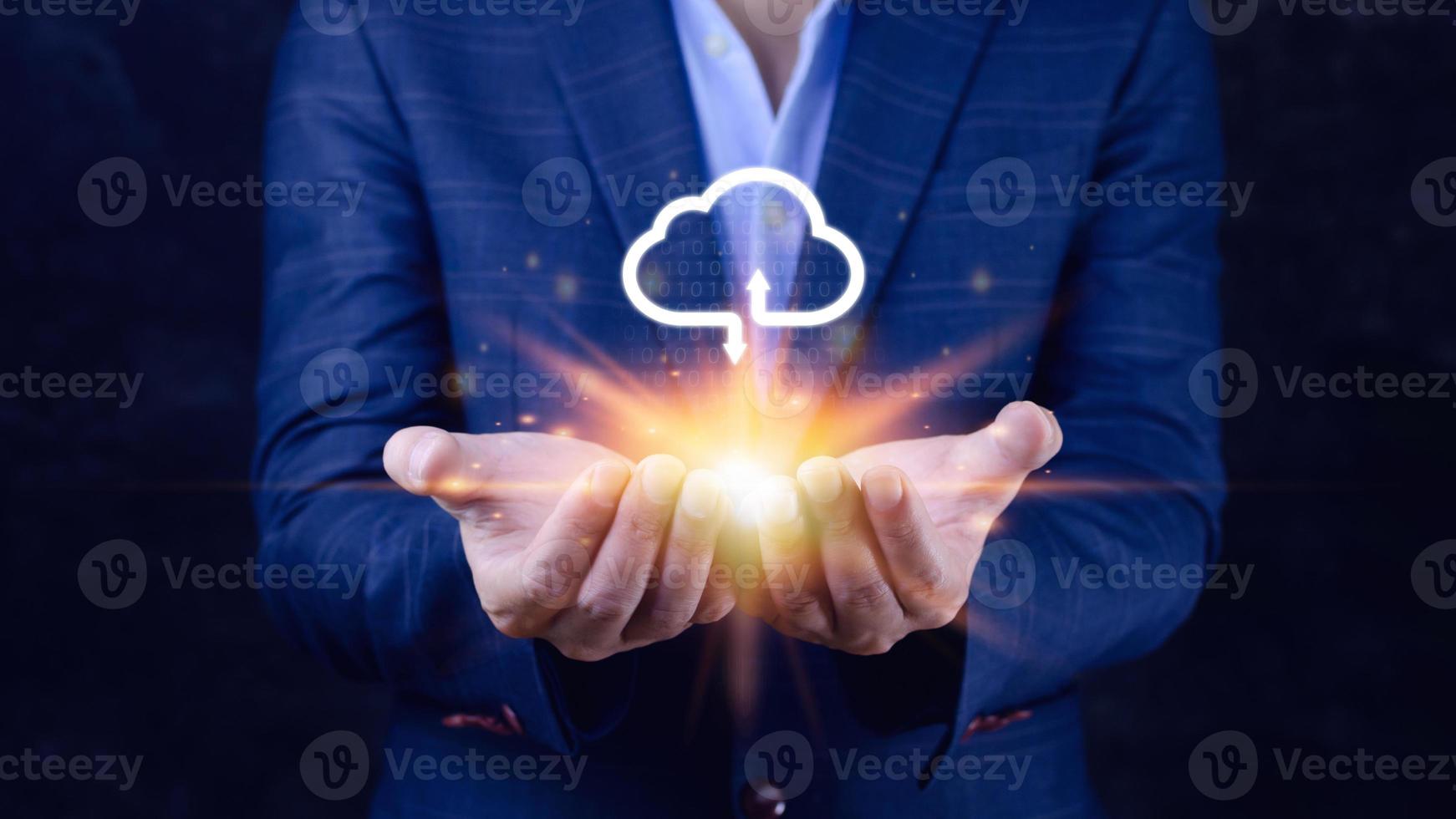 Businessman holding and giving virtual cloud icon computing with copy space to transfer data information and upload download application. technology transformation concept.Big data Concept Pro Photo