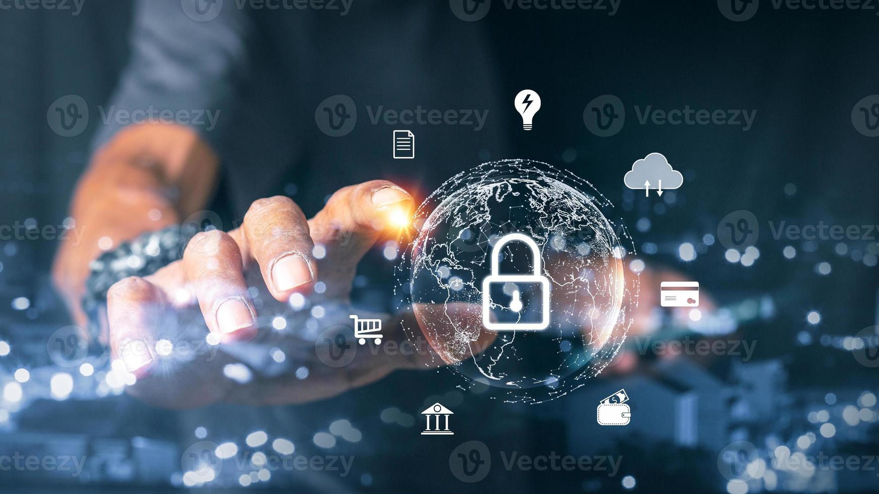 Cybersecurity and privacy concepts to protect data. Lock icon and internet network security technology. Businessman protecting personal data on smartphone, virtual screen interfaces. cyber security. Pro Photo