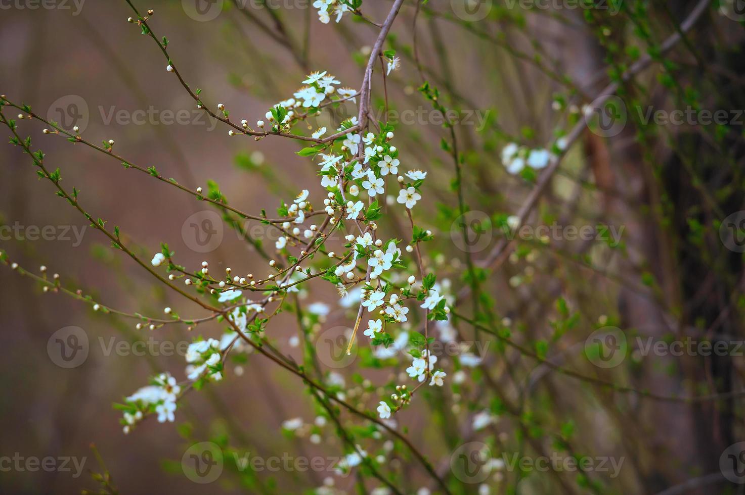 Branches of a blossoming tree with soft focus against the backdrop of a spring forest in the twilight sky. floral image of a panoramic view of spring nature, copy space Pro Photo