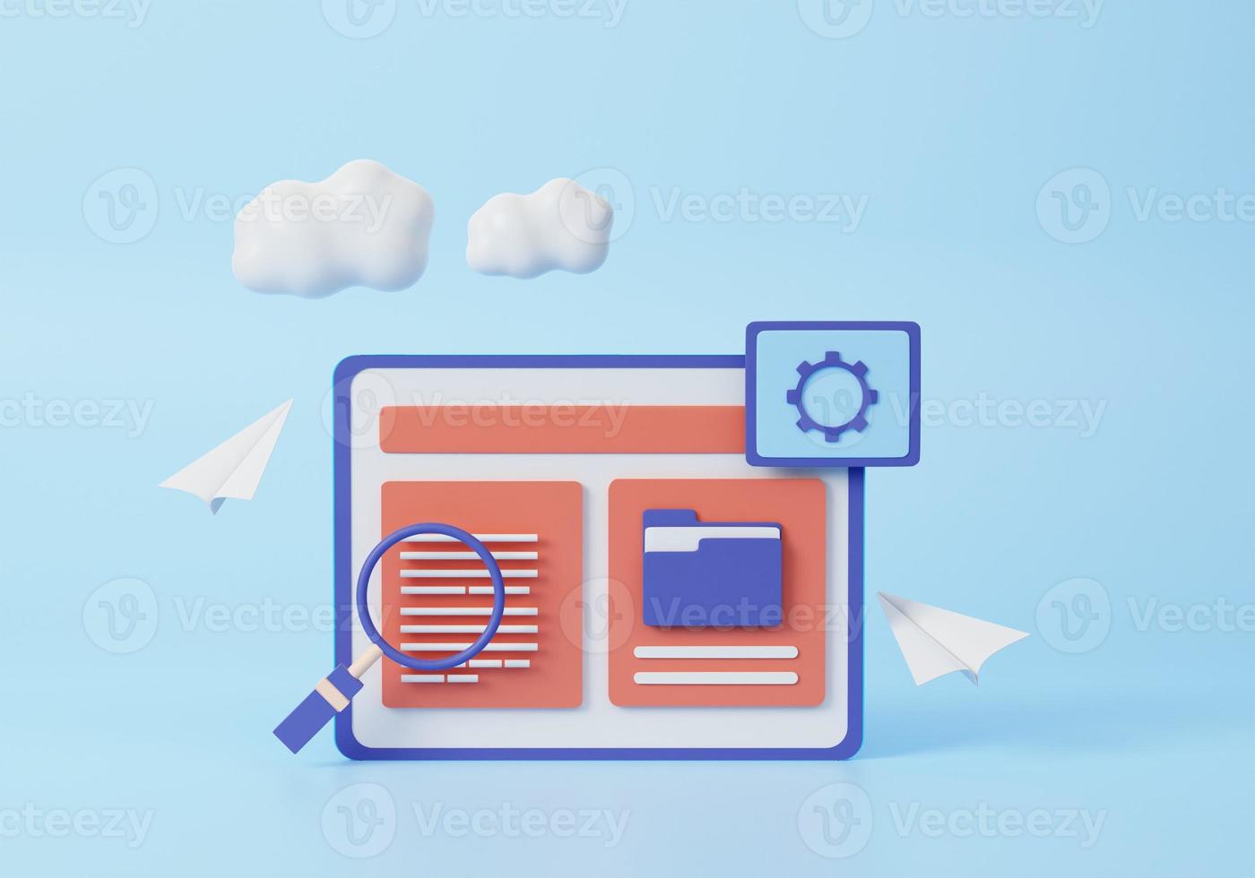 Concept of File management. Searching files in database. Document management soft, document flow app, compound docs concept. 3d rendering illustration. Pro Photo