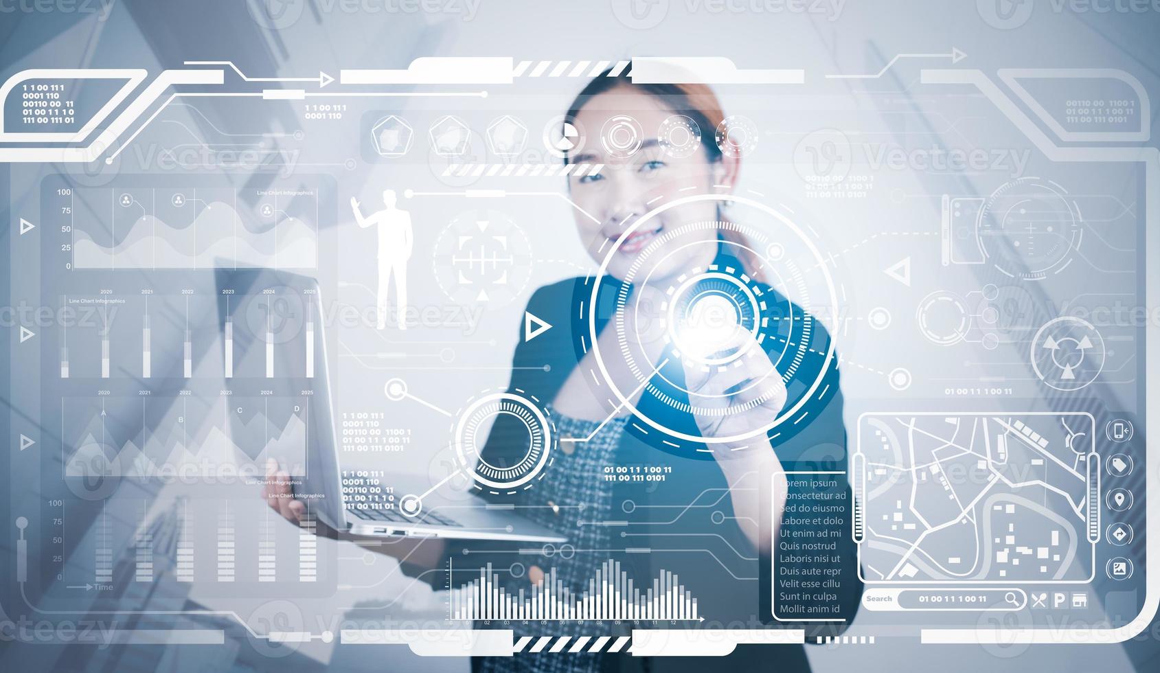 Woman using laptop with virtual world and model map with location point , GPS app, icon Travel maps and find places in the online system, all screen graphics are generated,Searching for travel. Pro Photo