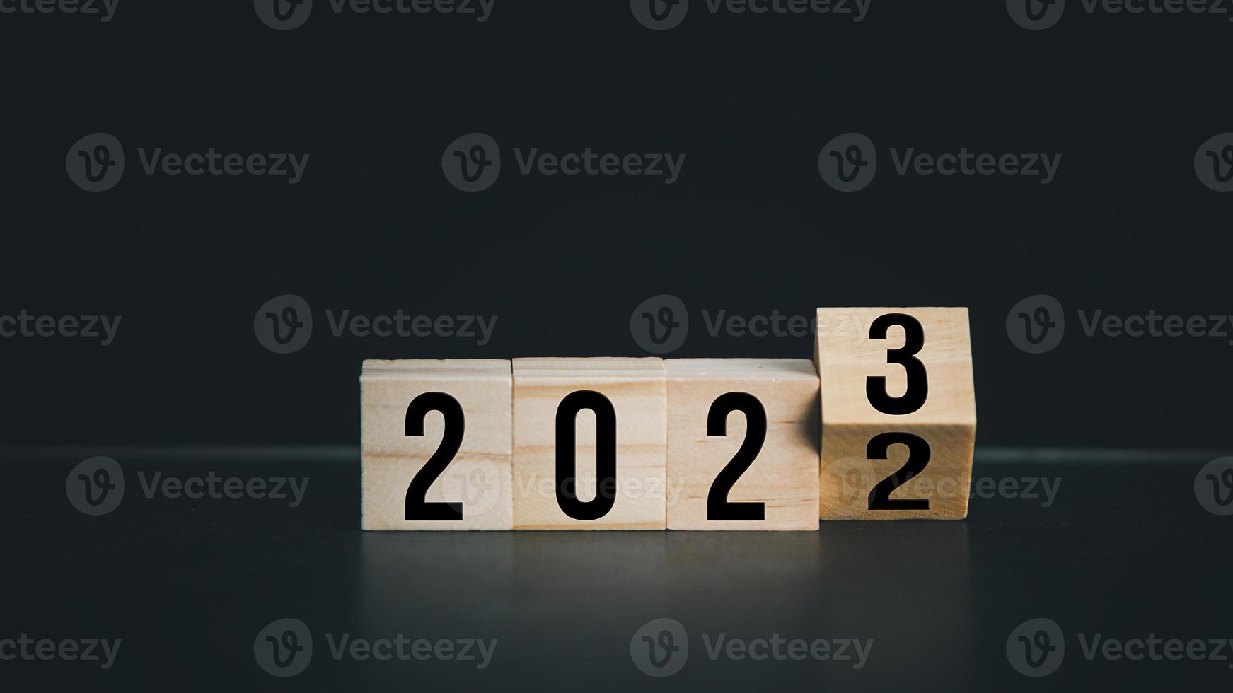 Flipping of 2022 to 2023 on wooden block cube for preparation new year change and start new business target strategy concept. on black background. Pro Photo