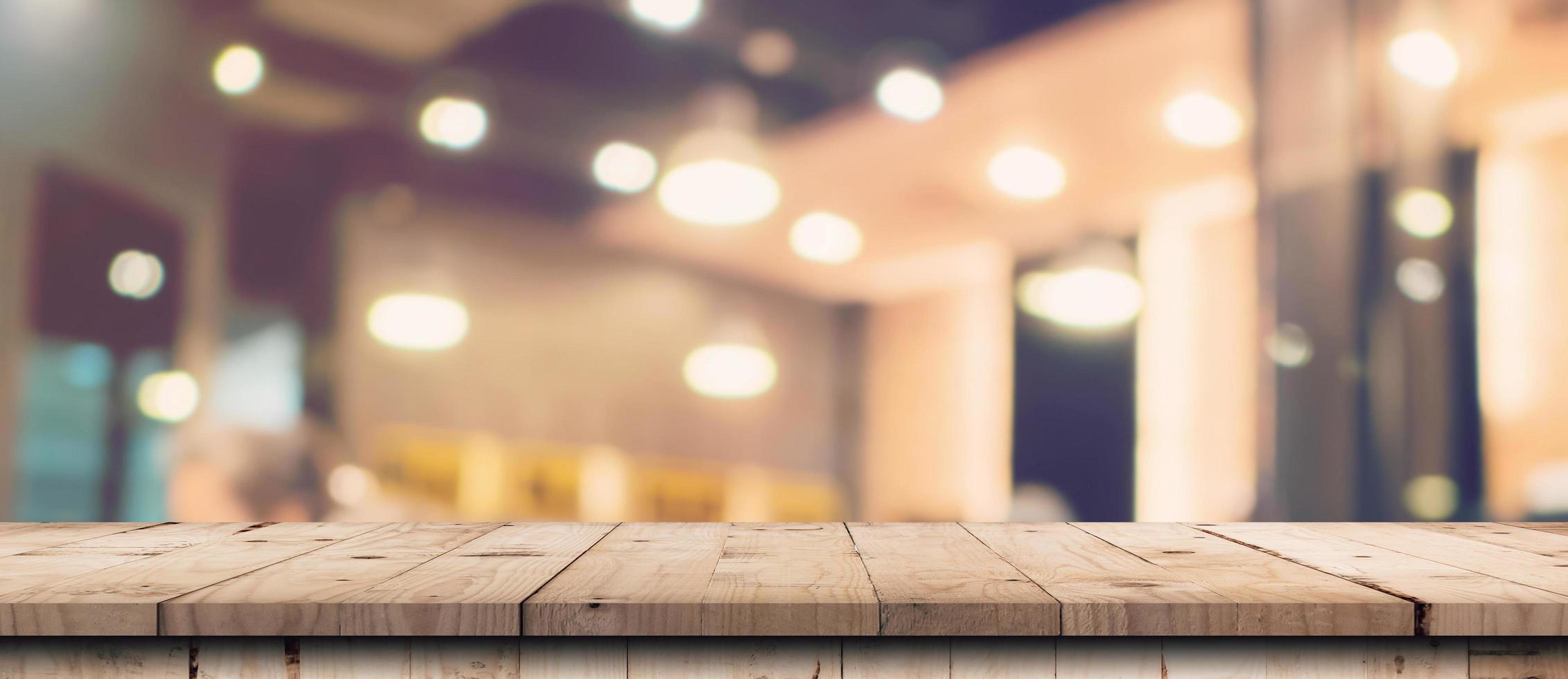 Abstract blurred image of department store with wooden table counter background for show , promote ,design on display concept photo