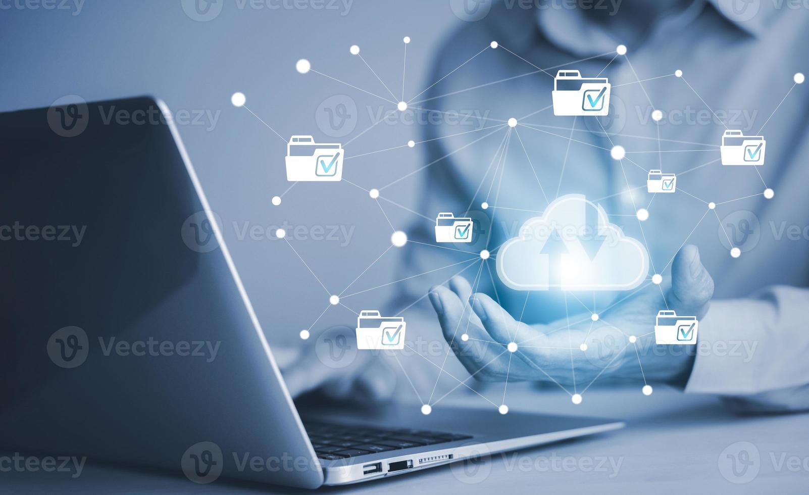 Businessman hold cloud icon and tablet with folder data information on the Cloud Computing Technology Internet Storage Network Concept, big data internet technology, Cloud sharing download and upload. Pro Photo