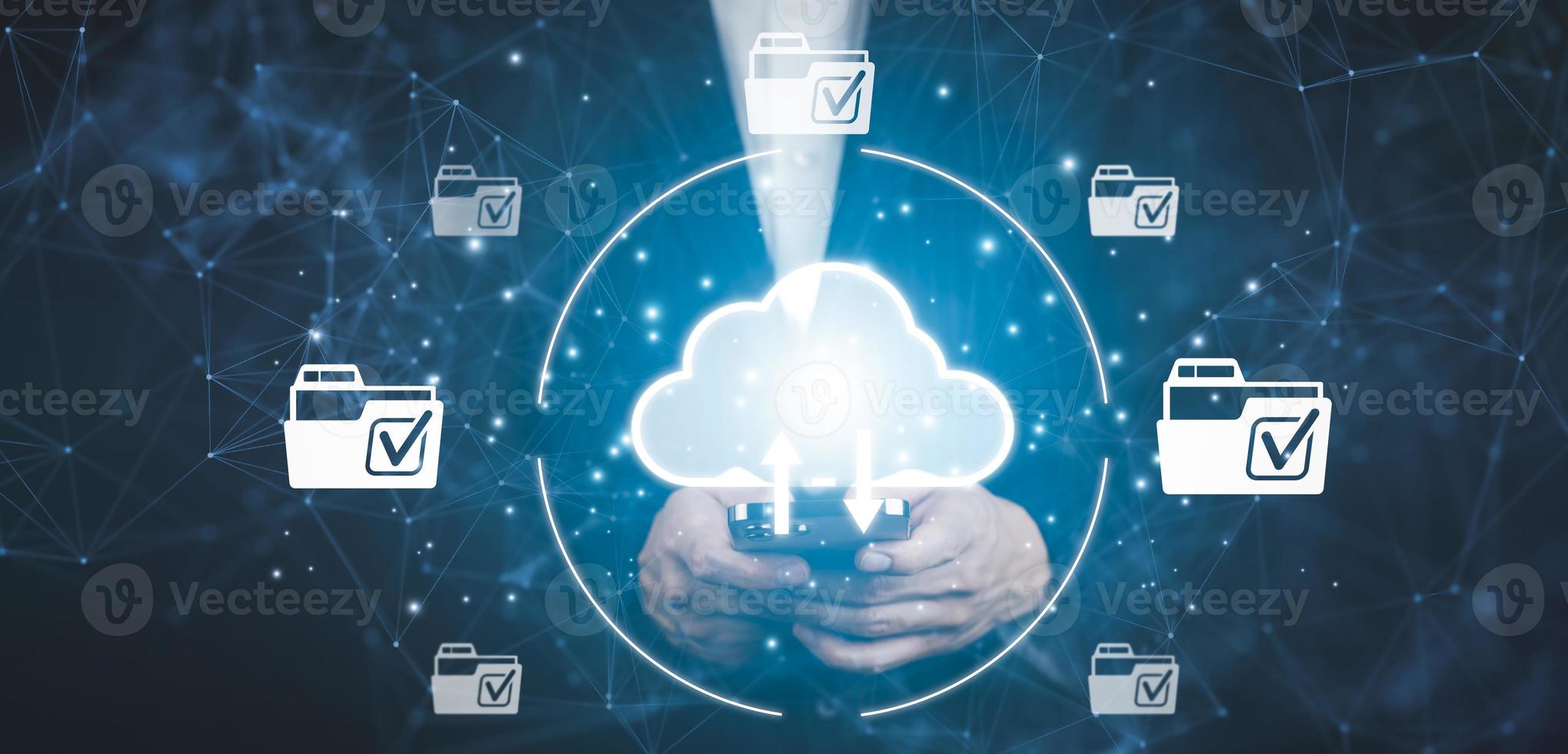 Businessman hold Smartphone with data information on the Cloud Computing Technology Internet Storage Network, big data Through internet technology, Cloud sharing download and upload Pro Photo
