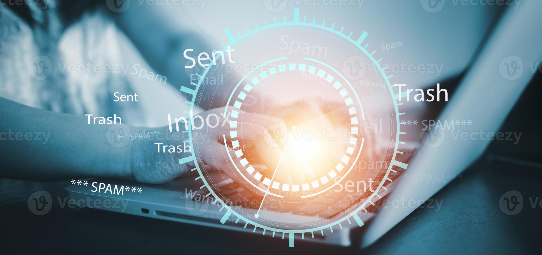 Email concept with laptop spam and virus computer monitor internet security concept, businessman reading electronic mail with a laptop. Spam, junk and e-marketing on screen, Spam Email Pop-up Warning. Pro Photo