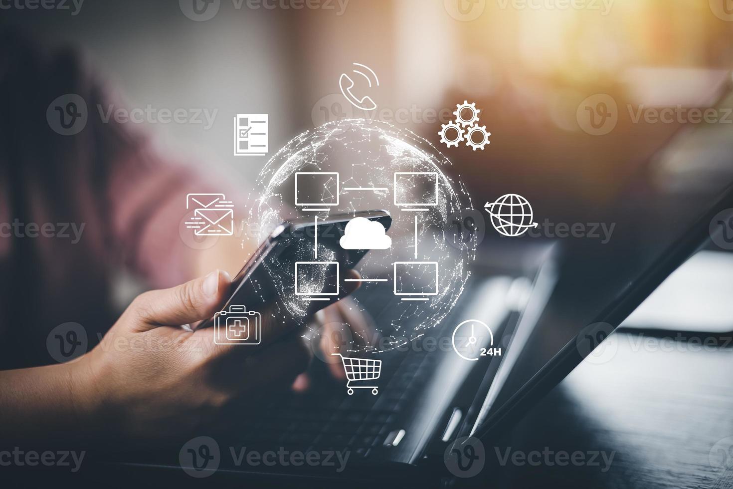 Smartphone with cloud computing and icon online storage concept, Cloud Computing Technology Internet Storage Network Concept And a large database big data Through internet technology, Pro Photo