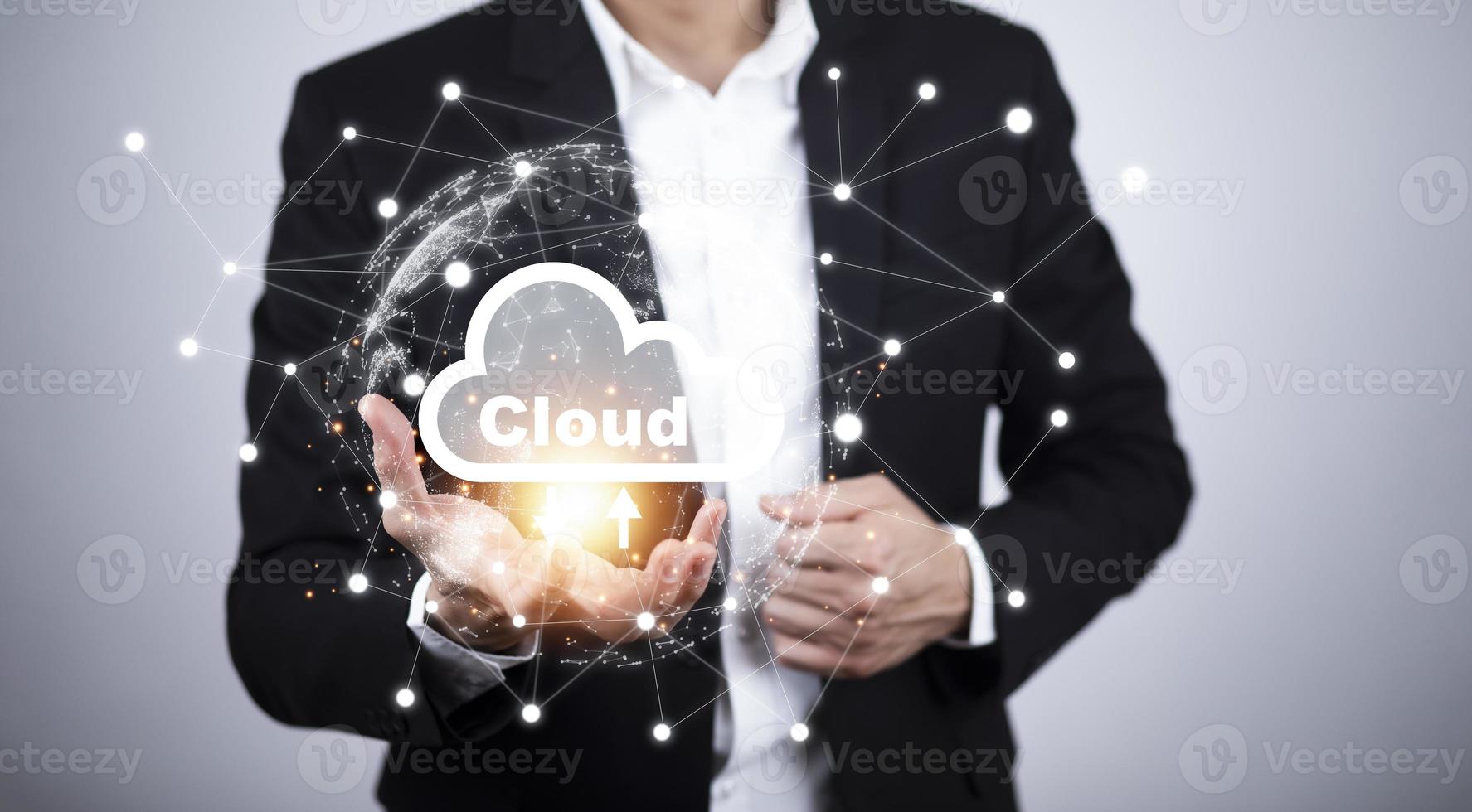 Man holding connect to data information on the Cloud Computing Technology Internet Storage Network Concept And a large database big data Through internet technology, Cloud sharing download and upload Pro Photo