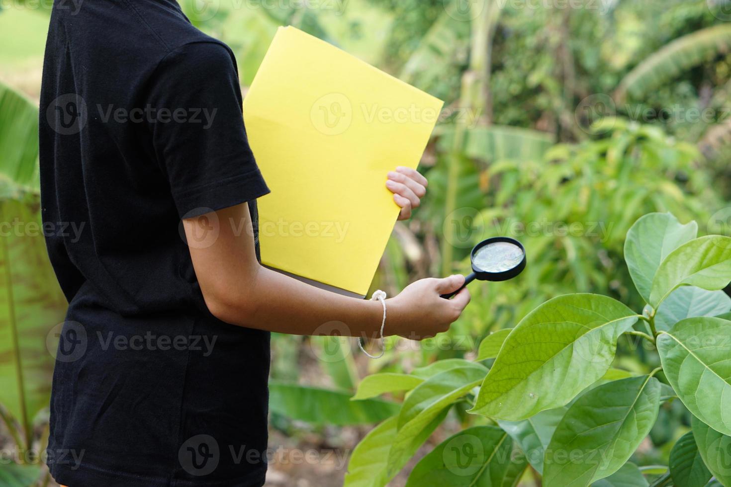 Closeup boy is learning about botanical plants lesson, holds magnifying glass and book. Concept, Science and environment project assignment from school. Self learning outside. Pro Photo