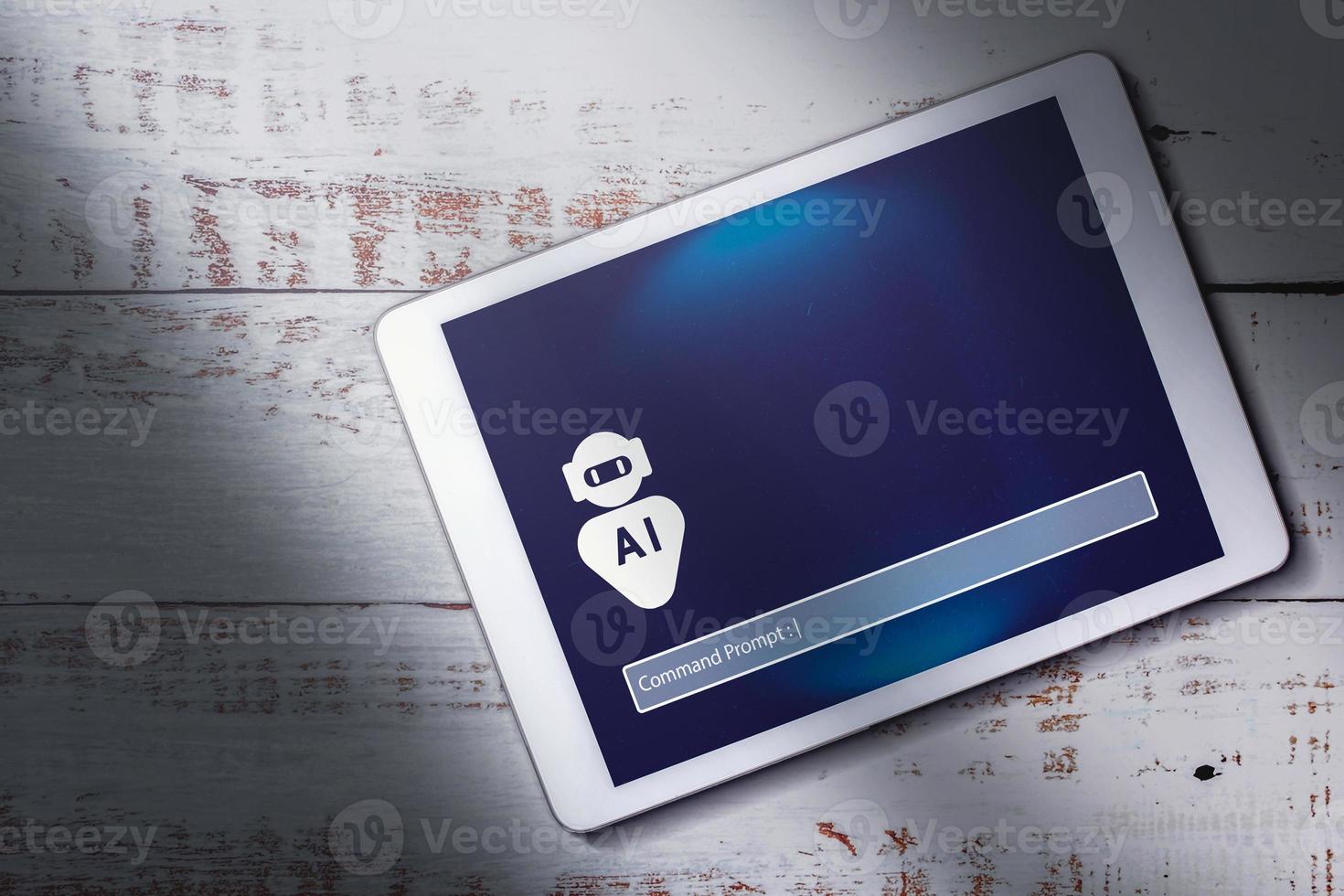 Top view of digital tablet with chatbot on screen and copy space. Command prompt AI concept. Artificial Intelligence. Futuristic technology transformation. Pro Photo