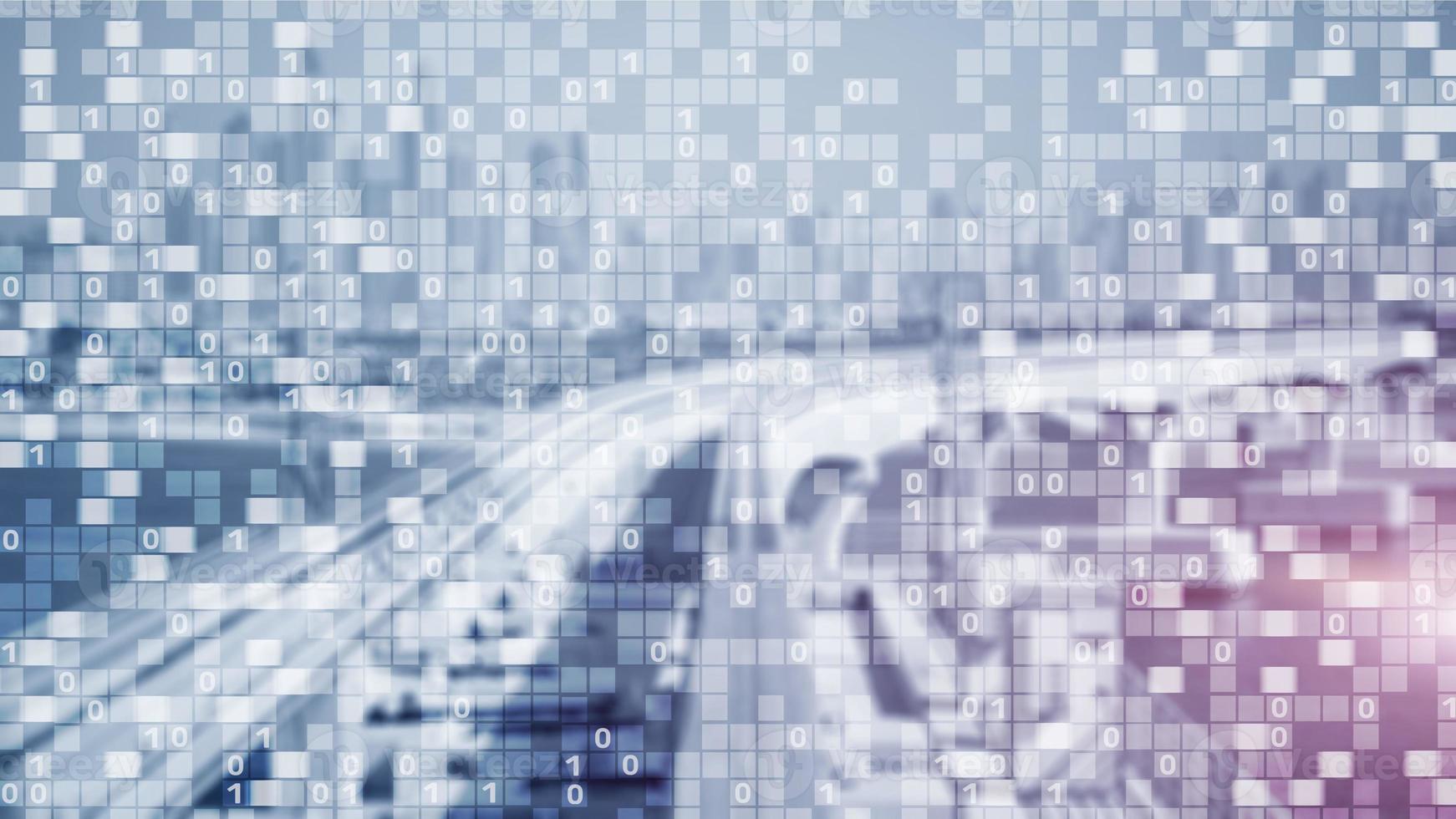 Digital code on blur city background. Abstract Binary code Pro Photo