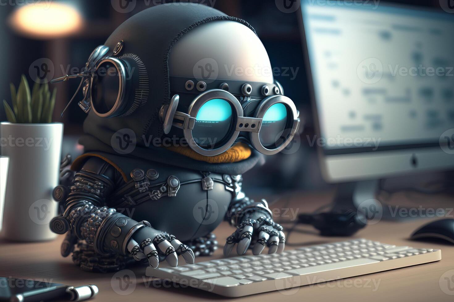 Cute Chatbot with glasses working with keyboard and computer. Pro Photo