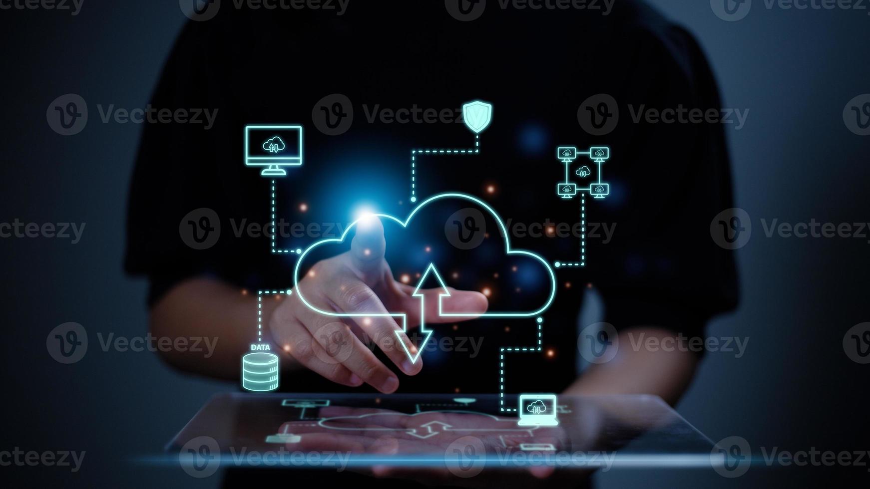 Cloud computing concept.Virtual cloud computing with world and technology items such as upload download. Cloud technology management big data includes business strategy and customer. Pro Photo