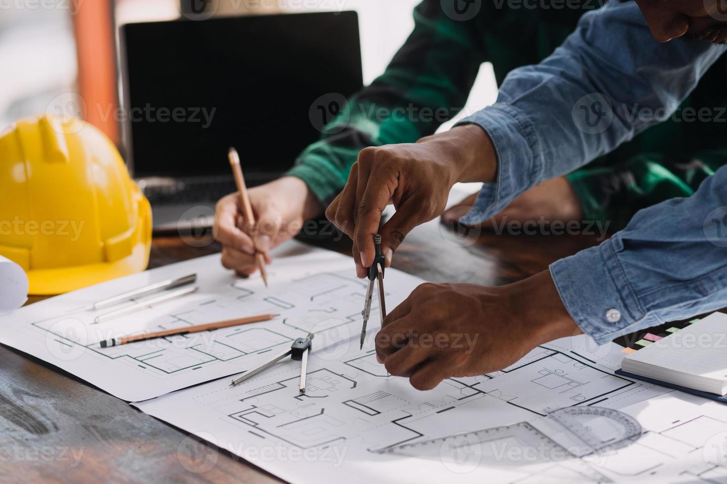 Image of engineering objects on workplace with three partners interacting on background Pro Photo