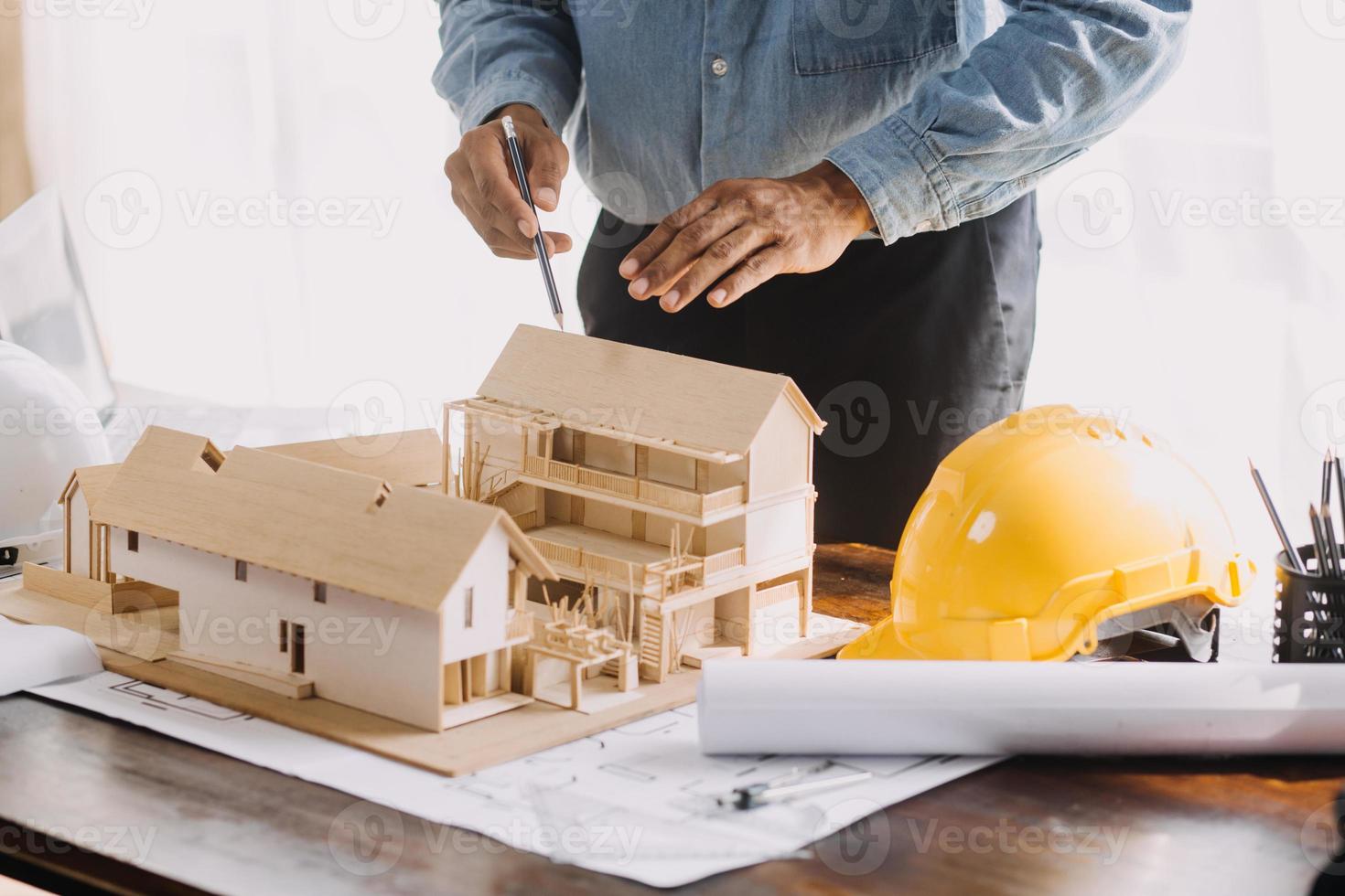 Image of engineering objects on workplace with three partners interacting on background Pro Photo
