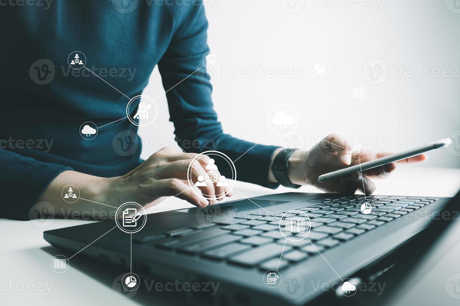 Concept global data connection with internet technology, users are using labtop for online transactions by internet technology, big data, database management, cloud computing, cashless society. Pro Photo