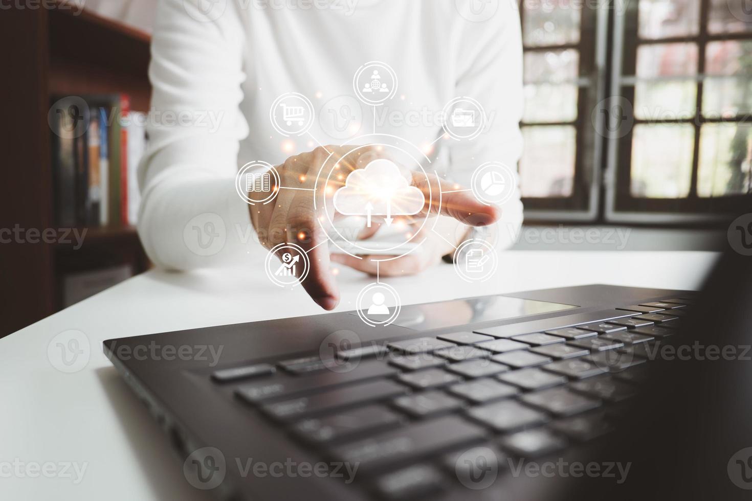 Concept global data connection with internet technology, user acess internet by smartphone and laptop, big data, database management, cloud computing, cashless society. Pro Photo
