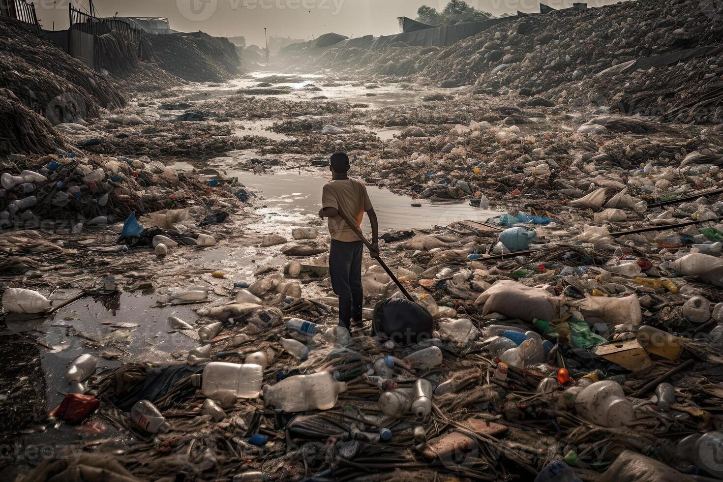 Mam standing in a huge dump with a lot of plastic waste and various used garbage. Environmental pollution concept. Created with Pro Photo