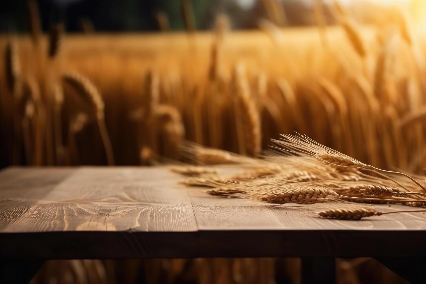 Empty wooden table in front of golden ears of wheat background. photo