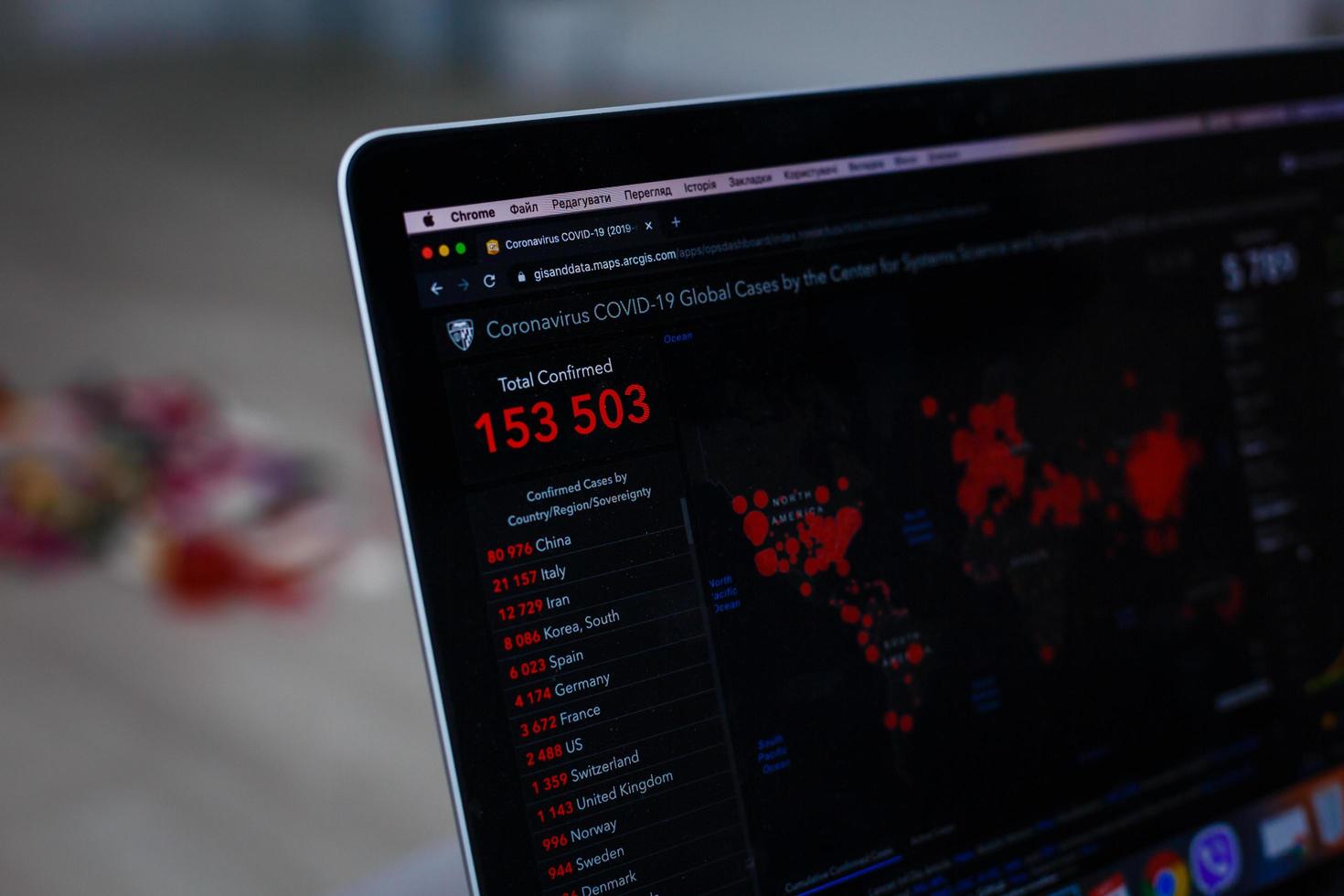 Screenshots from computer from gisanddata.com website reporting on Coronavirus Wuhan outbreak. Kyiv, Ukraine - MARCH 10, 2020 photo