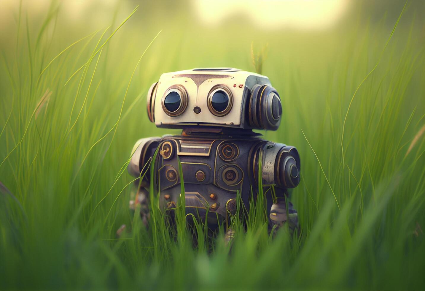 Robot toy in green grass field at sunset time. 3d rendering. photo