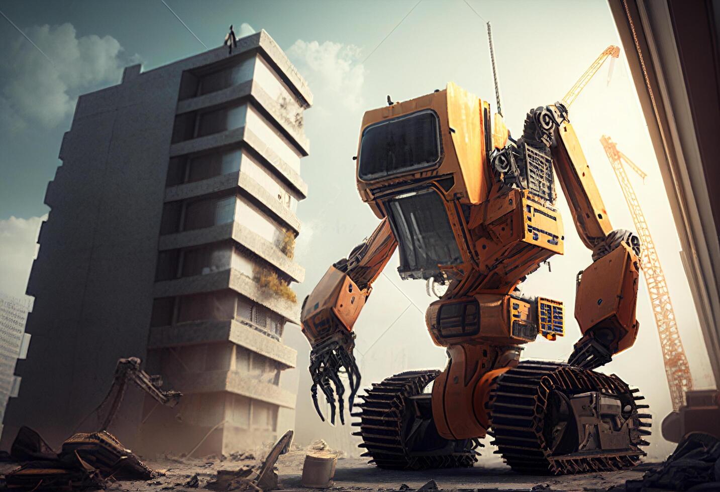 3d rendering of a robot in a construction site with buildings in the background photo