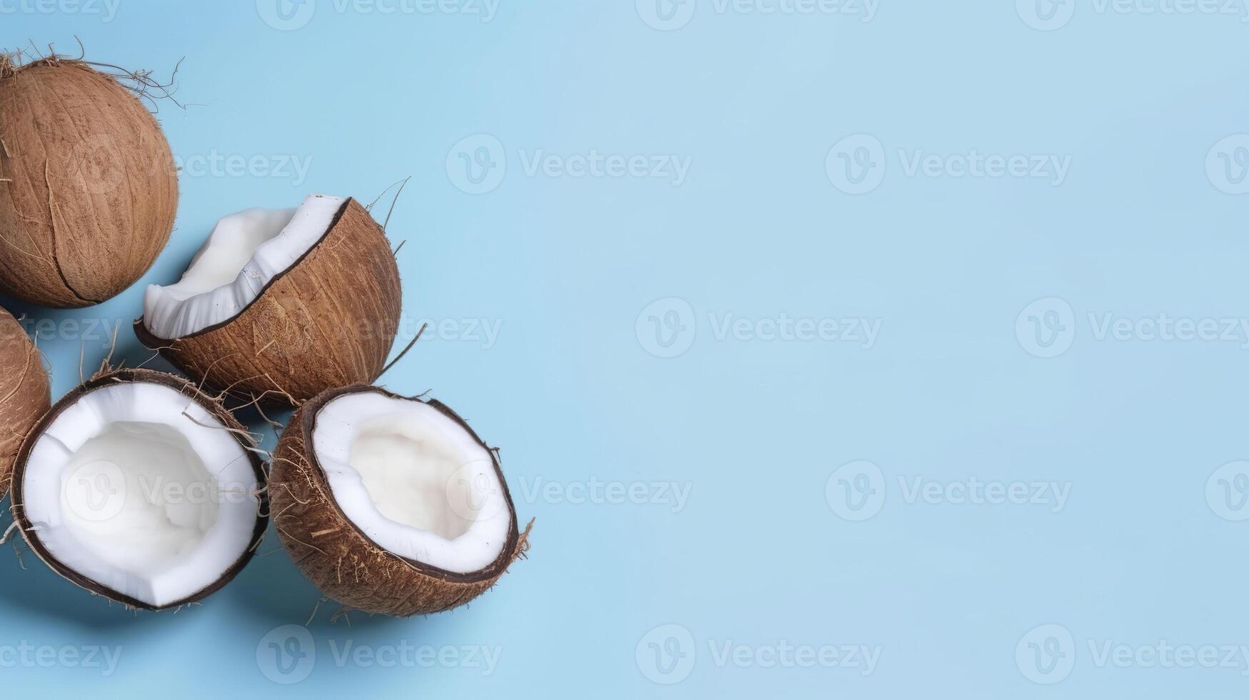 Banner with coconuts. Copy space, top view, summer background. . Pro Photo