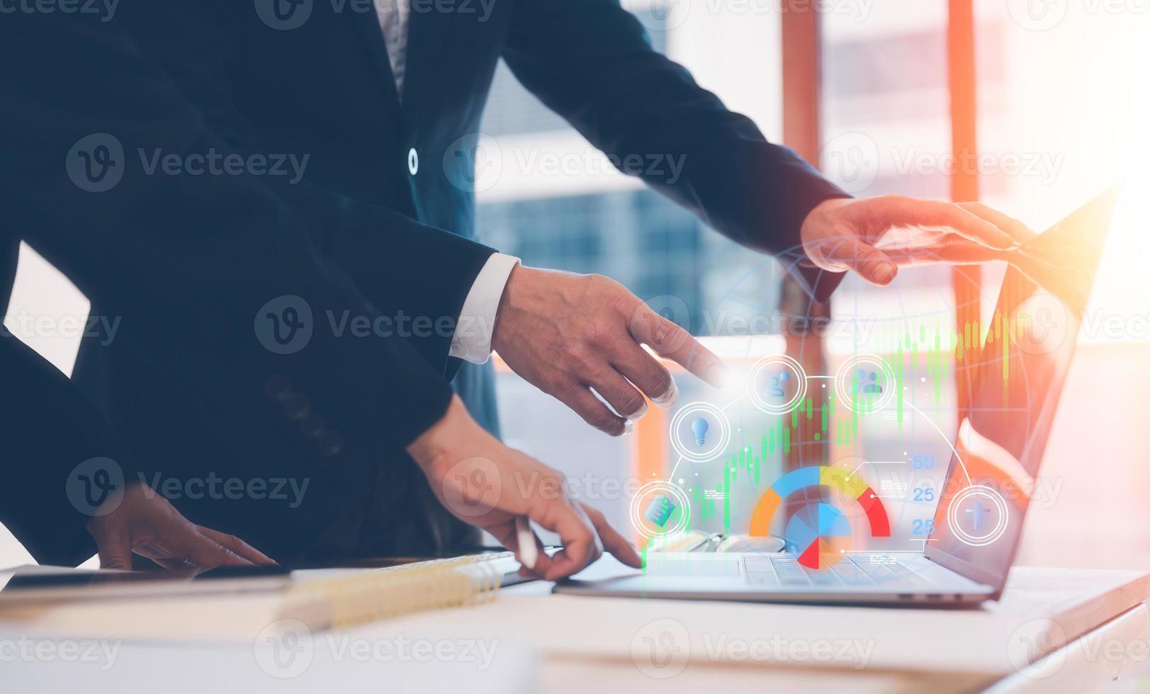 Analyst working with Business Analytics and Data Management System on computer, make a report with KPI and metrics connected to database. group discussion using computer laptop on office table. Pro Photo