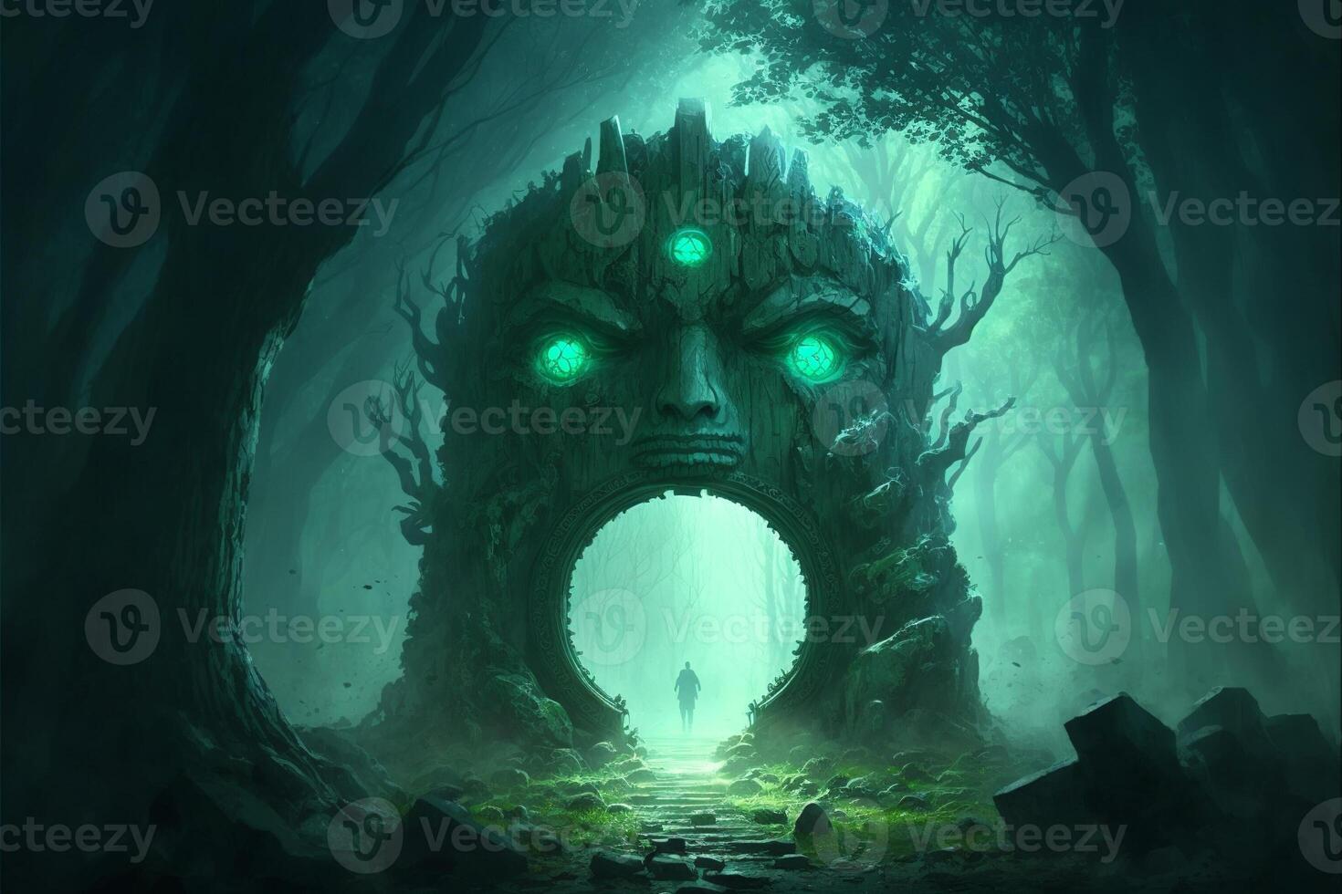 Mystical portal in the forest in the form of a golem's head, green mist. Pro Photo