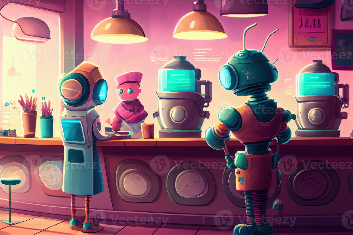 illustration of a futuristic robot cafe with a wide range of robot customers, where robots of all shapes and sizes come to enjoy a cup of java or a sweet treat Pro Photo