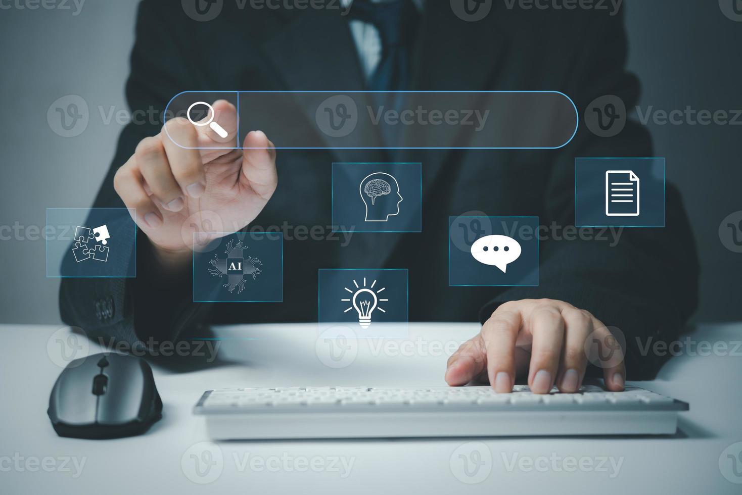 search ChatGPT chatting artificial intelligence chatbot. OpenAI Digital chatbot, chatGPT, robot Data Search Technology, Search Engine Optimization. Man using laptop computer Pro Photo