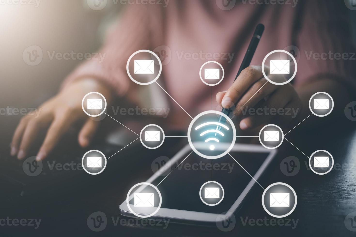 Concept Email with the laptop contact us, woman using pen touch the wireless icon and sending the e-mail from the laptop computer, Concept of sending emails from your computer, Big data Pro Photo