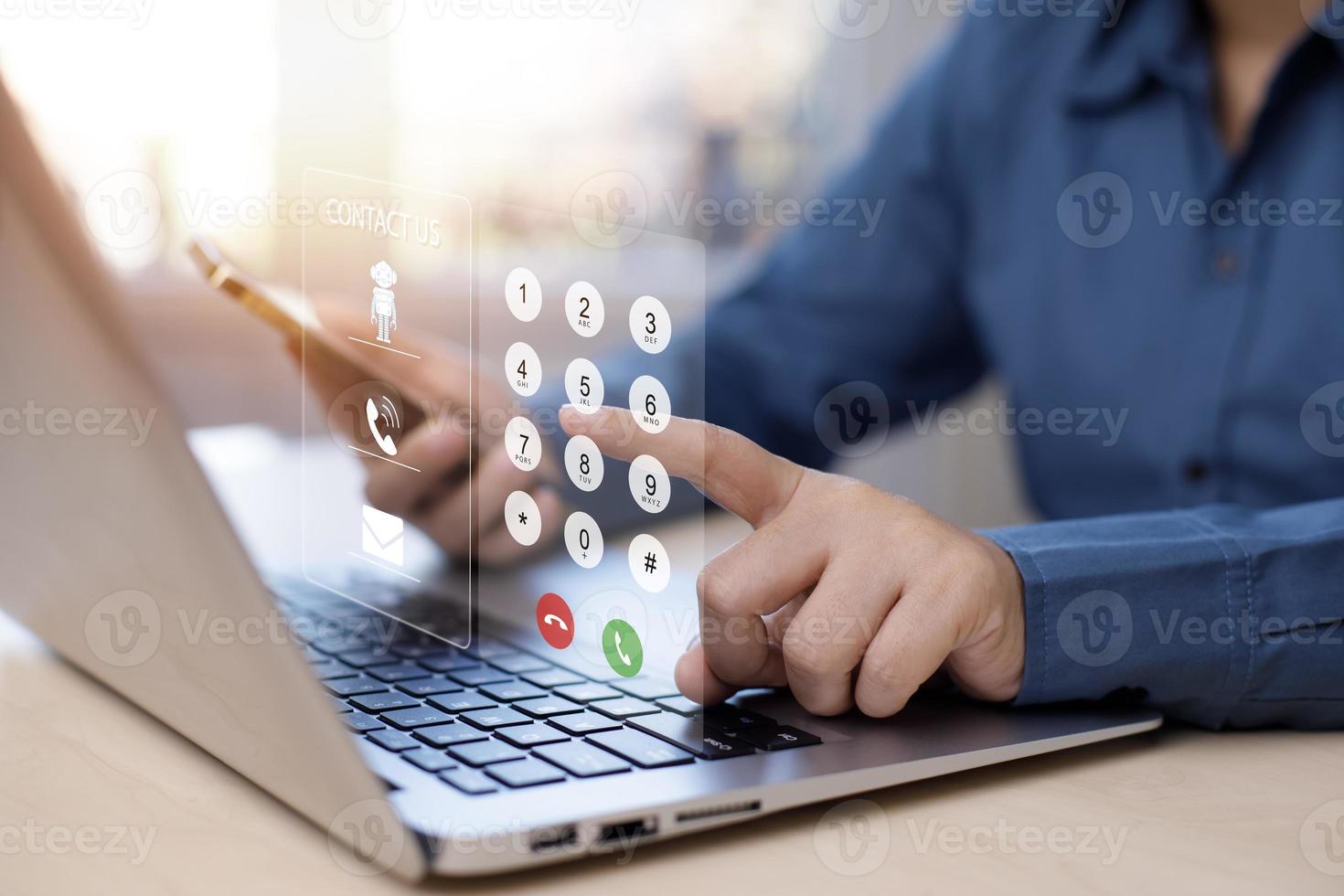 Communication and Contact us or Customer support hotline people connect. Hand using a laptop and touching on virtual screen contact icons, email and address, Chat bot, and live chat with internet wifi Pro Photo