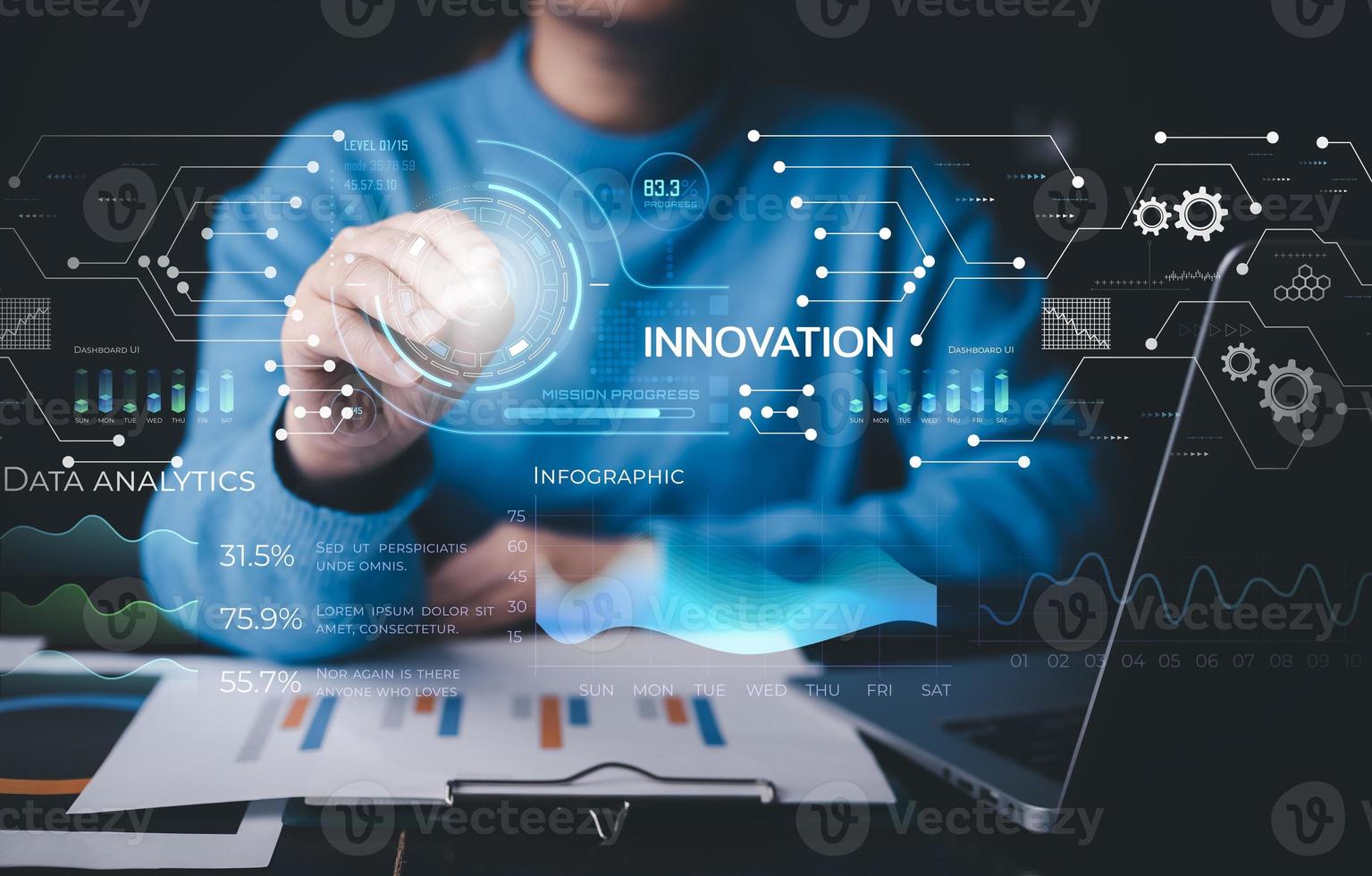 Innovation with Graphical User Interface and big data Concept, businessman using a laptop with touch Innovative ideas presented by management consultants on-screen, design, invention development Pro Photo